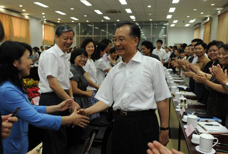 9月4日下午,温家宝在北京市第三十五中学主持召开北京市教师代表座谈会前,和出席座谈会的教师代表握手。新华社记者李学仁 摄